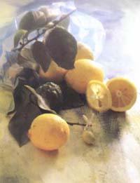 There are many different recipes that you may use to prepare your henna. Of paramount importance is that you use fresh well sifted henna. Fresh henna will give you the best and darkest color with the least amount of effort (fresh henna has a light green color, vs. old henna which is more of an olive green). Well sifted henna (i.e., henna powder devoid of small twigs and other foreign objects), will help to keep your applicator from clogging. In order to make the henna powder release the dye a mild acid must be used. Such acids include lemon juice, lime juice, or vinegar. Henna will not release hennotannic acid unless it is at a 5.5 ph or higher. If you have very high quality henna, lemon juice is all that you need to make your henna release dye and be beautiful. | ![]() by Ulla Mayer-Raichle |
